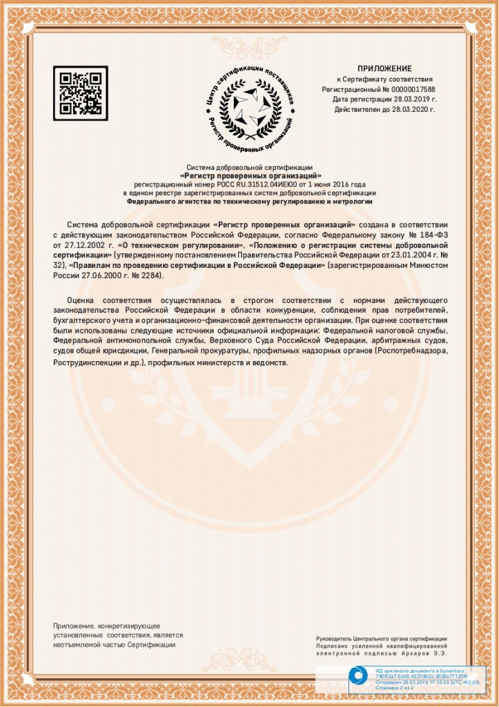 Сертификат соответствия, выданный Центральным органом сертификации ООО "Центр сертификации поставщиков" на основании проведенных исследований, отвечает требованиям стандарта ГОСТ РПО 2016:2019 (VCS RAO 2016:2019)