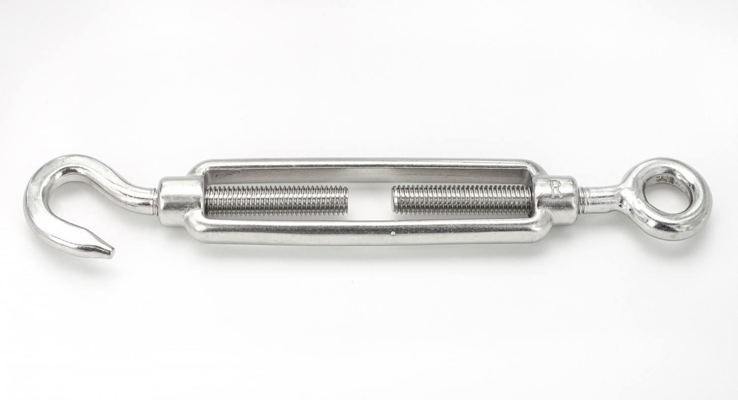 Талреп открытый DIN 1480 Крюк-Кольцо изготовлен из нержавеющей стали марки А4 и предназначен для эксплуатации в средах, которые разрушительно влияют на структуру углеродистых сталей.
