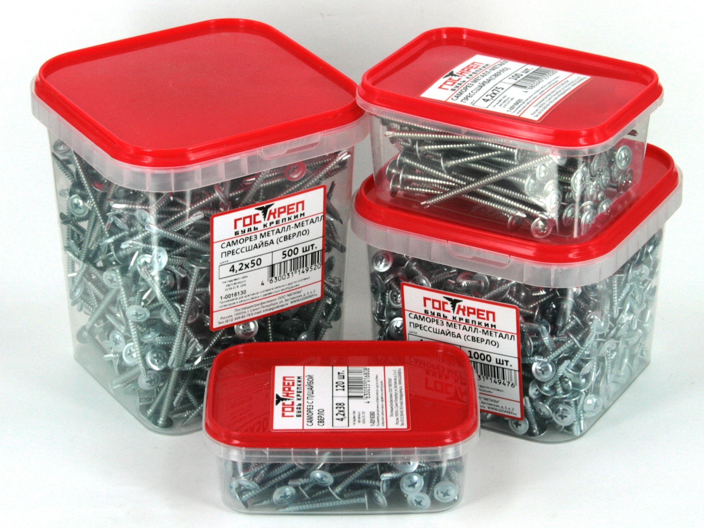 Саморезы с прессшайбой сверло продаются в размерах от 4,2х13 до 4,2х75 и следующих упаковках: пром короб, прозрачные пластиковые контейнеры крупной и средней фасовки и подвесы для штучной продажи метизов.