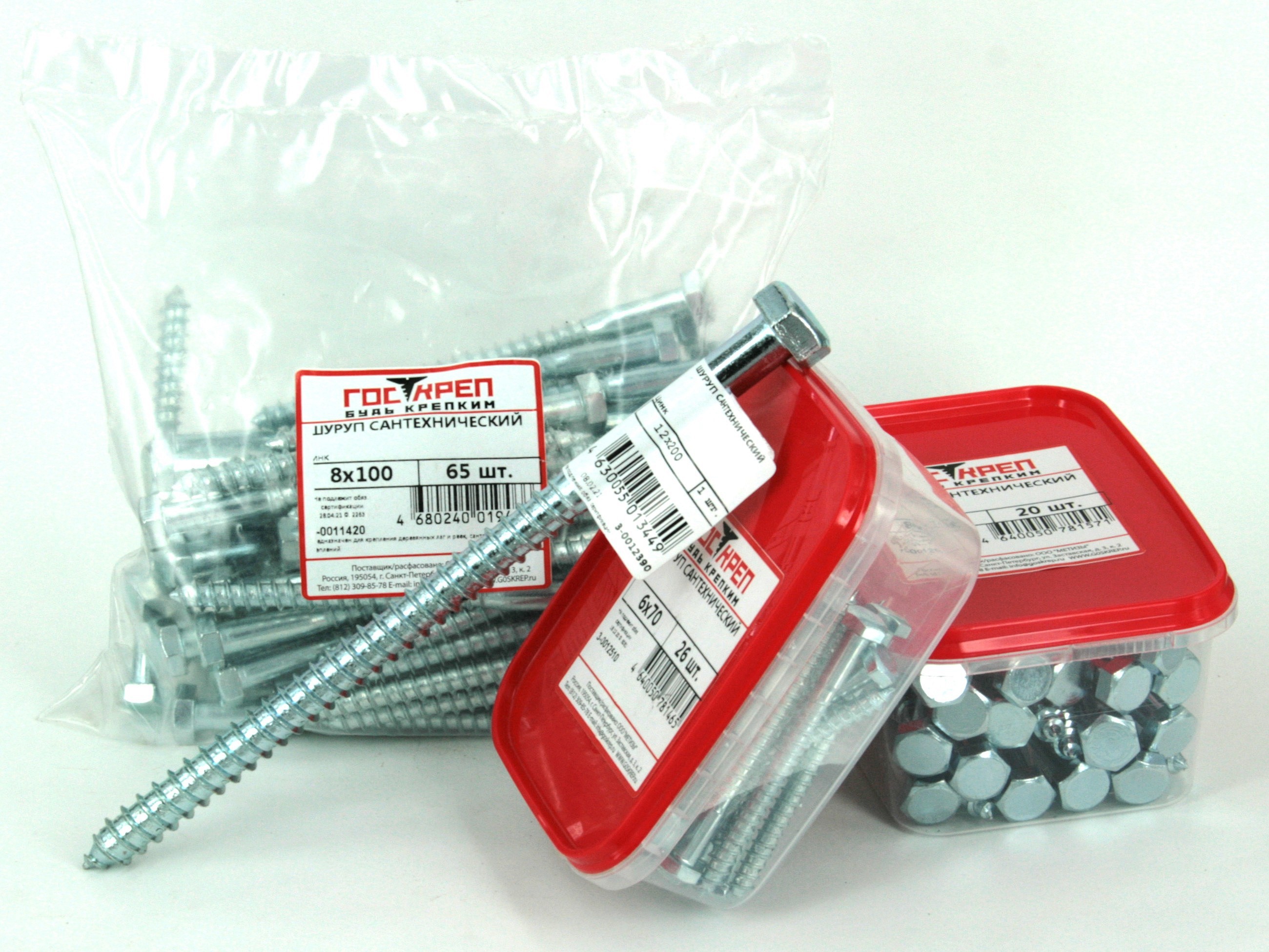 Шуруп глухарь DIN 571 - металлический стержень, оснащенный крупной резьбой под углом в 60 градусов и острым наконечником. Шуруп может иметь полную резьбу или частичную, немного не доходящую до края шляпки.