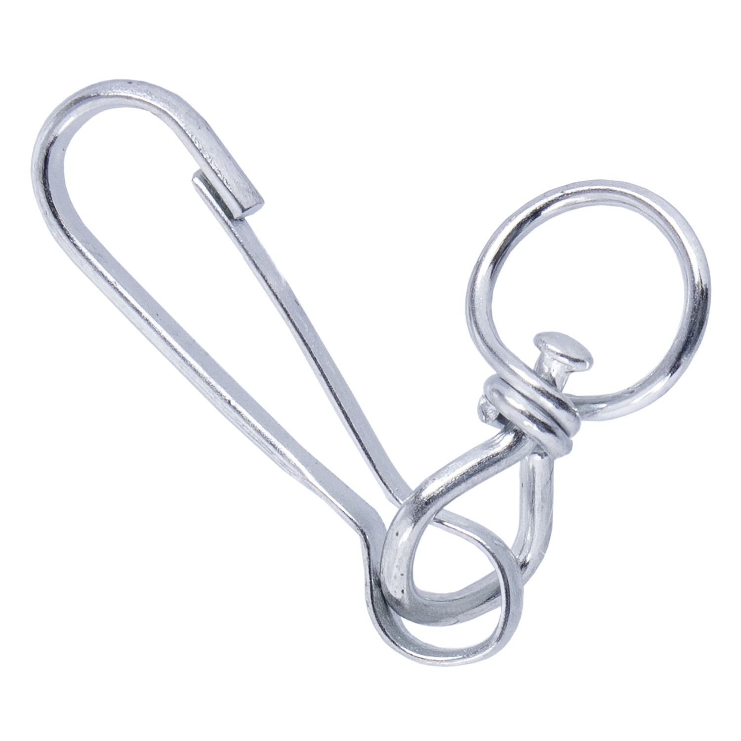 Карабин и кольцо с вертлюгом изготовляют из углеродистой стали с оцинковкой. Чтобы присоединить карабин, достаточно надавить на одну из стенок, где концы изделия примыкают внахлест. За счет эффекта памяти металла концы карабина вновь образуют замкнутую форму, что препятствует выскакиванию фиксируемых элементов.